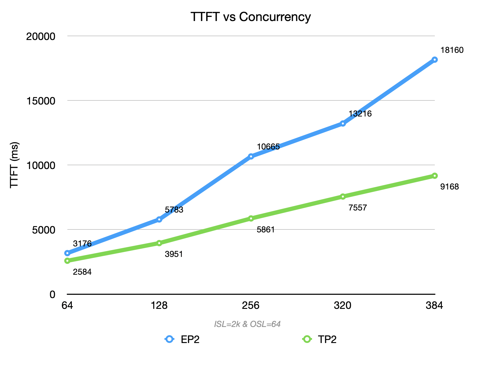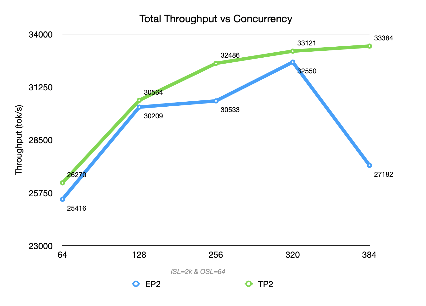 - In contrast, for output-heavy case, the TPOT advantage of EP=2 becomes dominant, and it is therefore the preferred configuration.